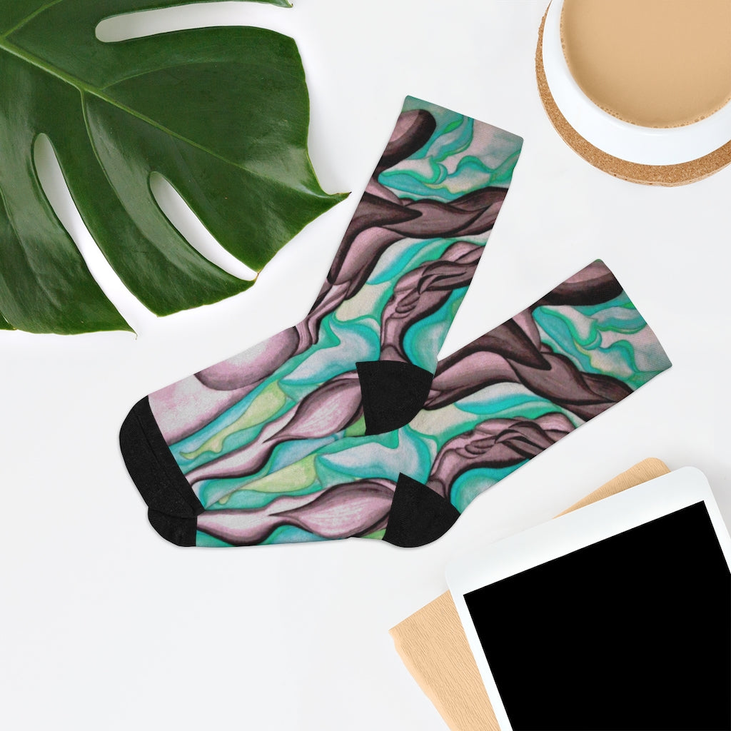 These DTG socks are made using a proprietary blend of yarns specially sourced by Tribe Socks. They are 200 needle knit crew with a half terry cushioned bottom for extra support and comfort. They are a true one size fits most, and are available up to size 12 Men's (U.S.). These socks have an unprecedented amount of stretch with durable print quality.