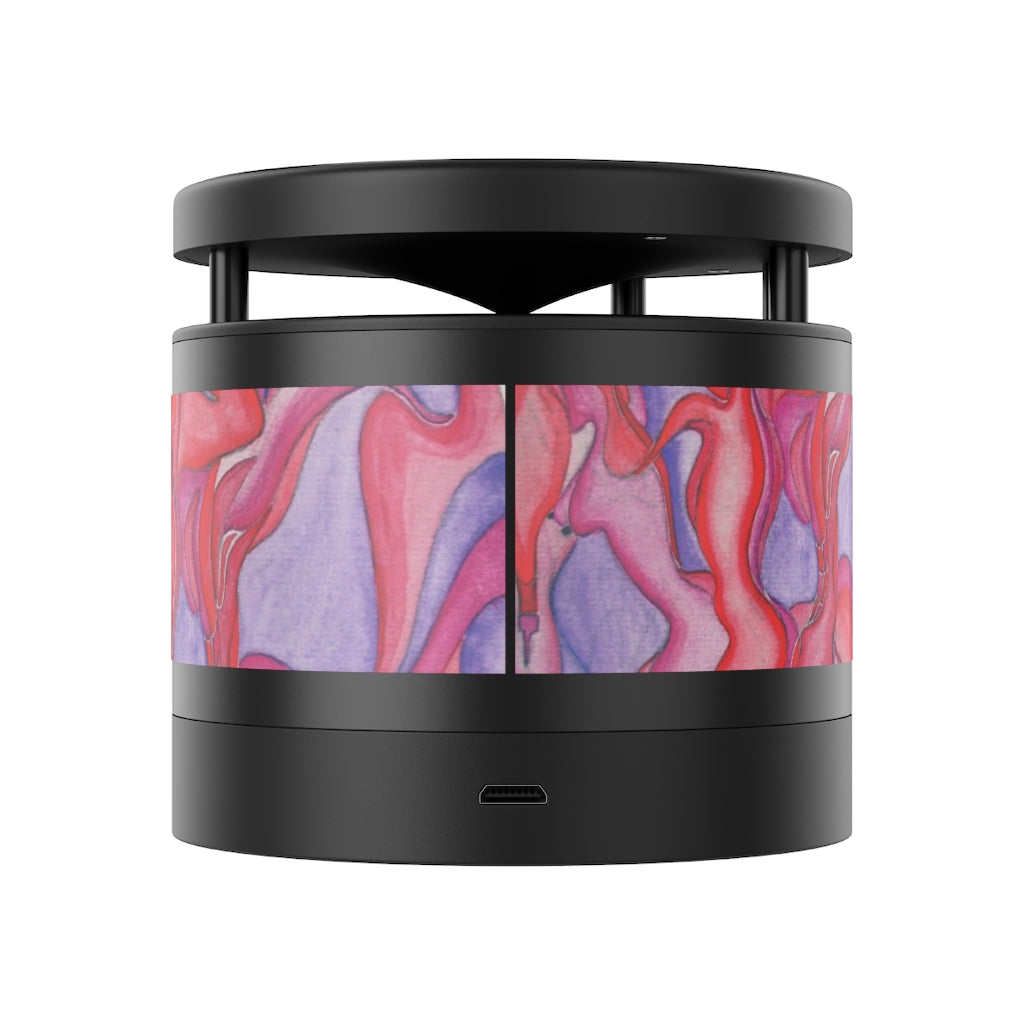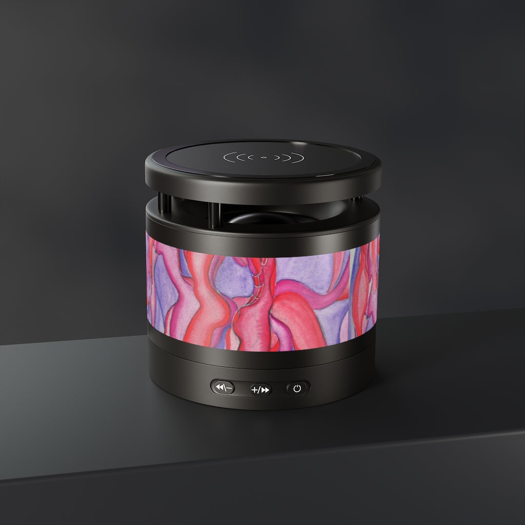 Equipped with Bluetooth version 4.2, a 33ft connection range, and a 3W output, this Aluminum-bodied, personalized Bluetooth speaker delivers crystal clear sound anywhere you go. Connect any Android/ iOS phone (including iPhone X) and listen at max volumes for over 2 hours. The top part of the speaker is a smart wireless charging pad. Package includes: 2 in 1 USB charging cable & 3.5mm Aux cable.